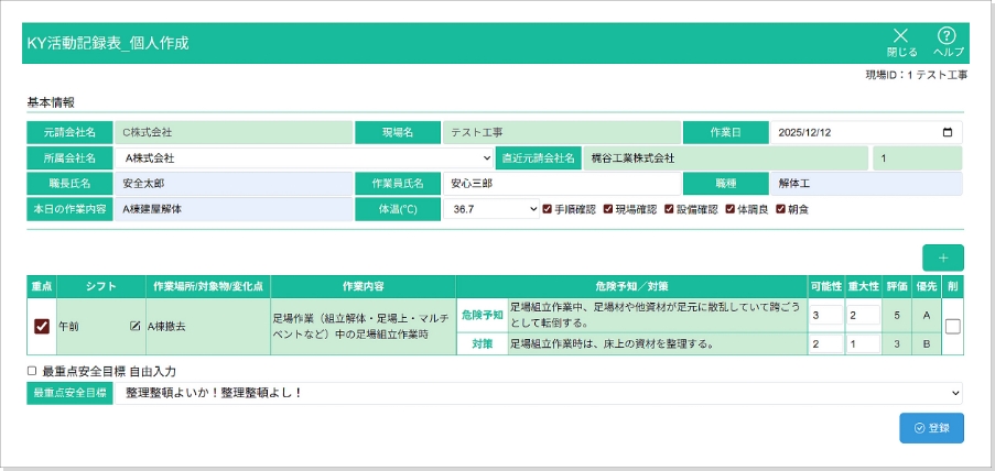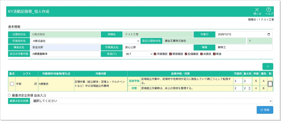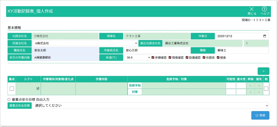 • 作業者氏名、職種、本日の作業内容などを入力しKYのベース情報を作成