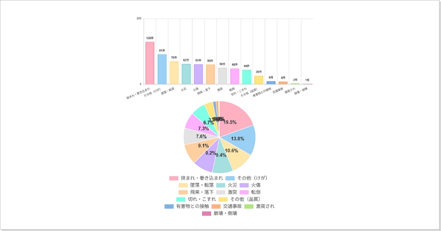 • 登録されたKYデータを「事故の型別」に自動分類し、グラフで可視化