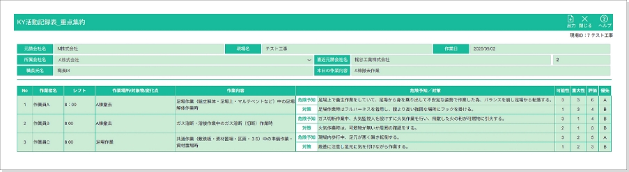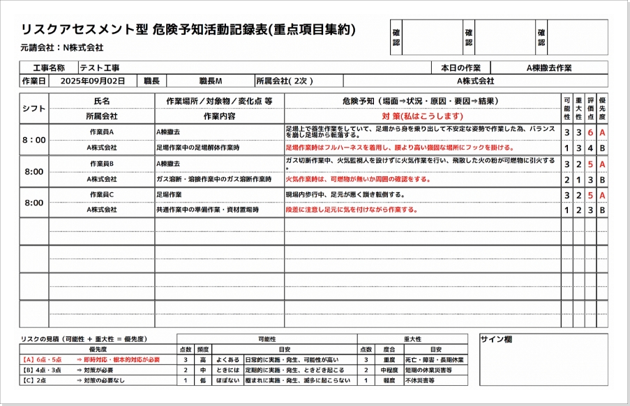 • 作業日、作成者氏名、職長氏名
