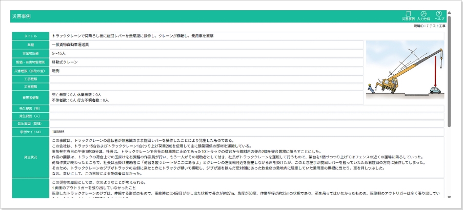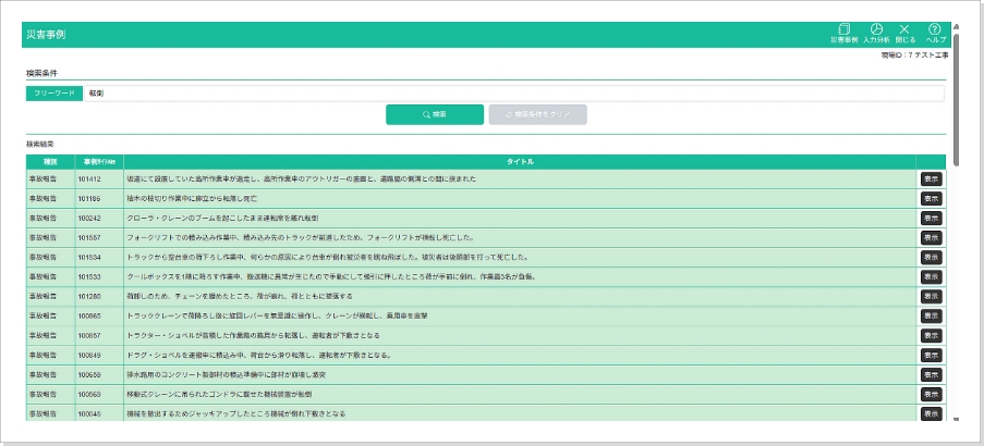 • 分析グラフ上の事故分類から、関連する災害事例・ヒヤリハット情報が抽出され詳細を参照